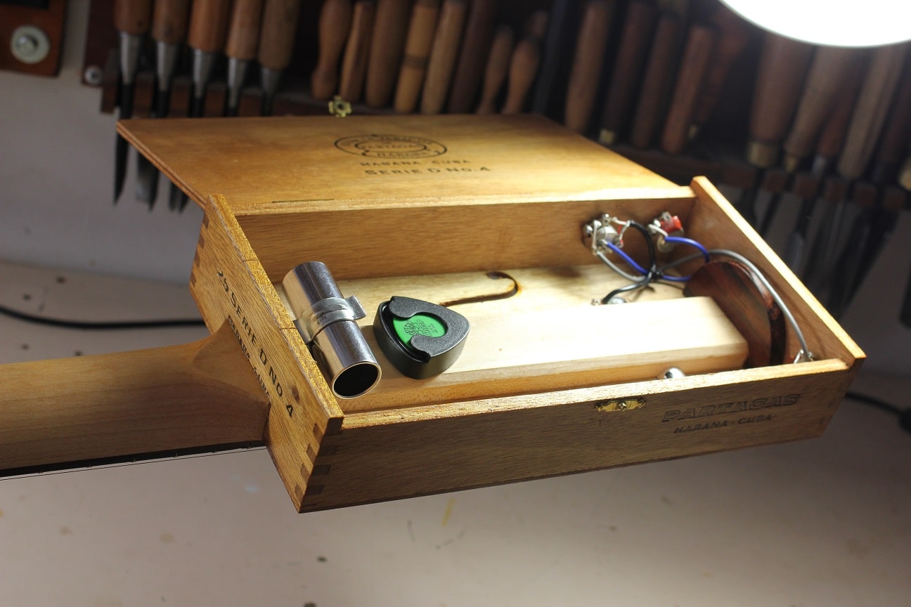 Si un modèle sur mesure vous intéresse n’hésitez pas à me contacter. Les possibilités sont infinies et toutes les pièces sont uniques. Pour un budget de base de 800 euros vous pouvez aussi faire l’acquisition de votre propre cigarbox de lutherie.