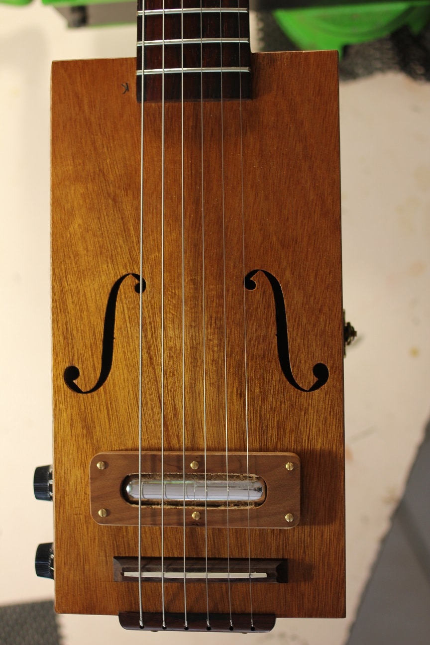 A l’origine il ne s’agissait que d’instruments sommaires souvent assemblés à la hâte à l’aide d’un manche à balai sur lequel on tendait une ou deux cordes. Le modèle que je vous montre aujourd’hui est un peu plus évolué, avec un manche spécialement conçu qui se rapproche de celui d’une guitare électrique Telecaster de chez Fender. Elle est aussi équipée d’un micro et peut se brancher sur n’importe quel ampli de guitare.